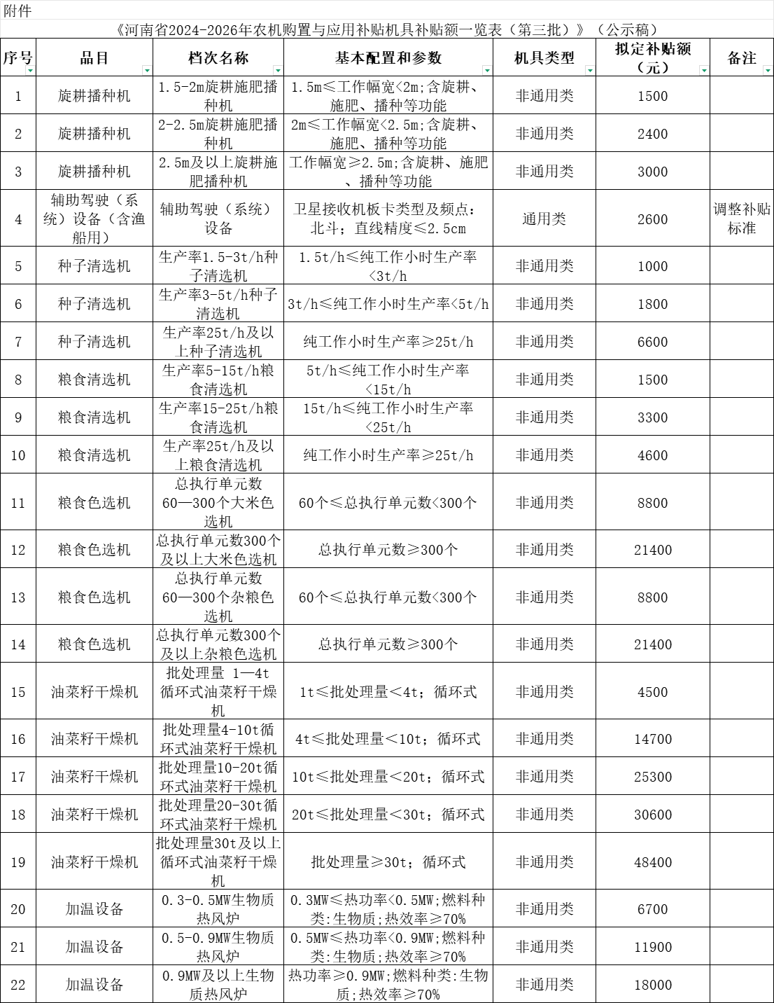根据农业农村部、财政部有关农机购置补贴与应用补贴的政策规定和《河南省2024-2026年农机购置与应用补贴实施指导意见》精神,结合我省实际,经专家论证、集体审议等程序,制定了《河南省2024-2026年农机购置与应用补贴机具补贴额一览表(第三批)》(公示稿)(以下简称《第三批一览表》),现予公示。