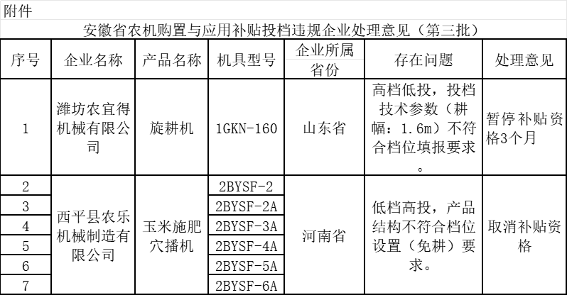 附件:安徽省农机购置与应用补贴投档违规企业处理意见(第三批)