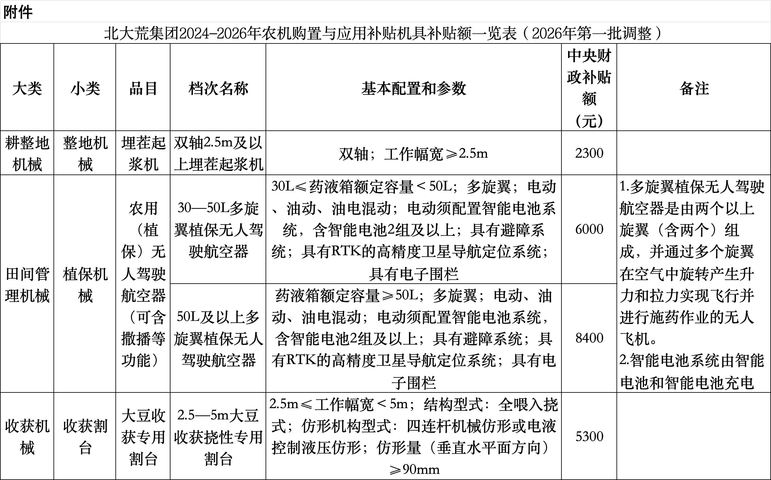 附件:北大荒集团2024-2026年农机购置与应用补贴机具补贴额一览表(2026年第一批调整)