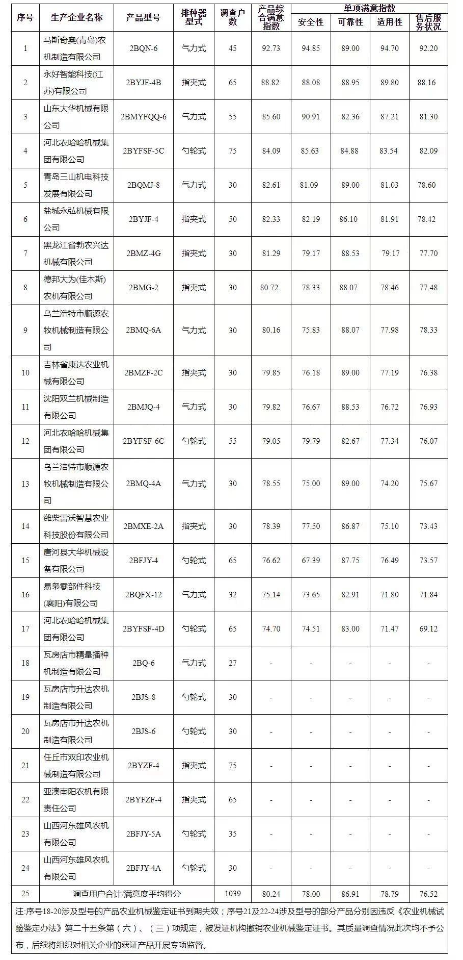 2025年部分单粒(精密)播种机质量调查用户满意度评分表